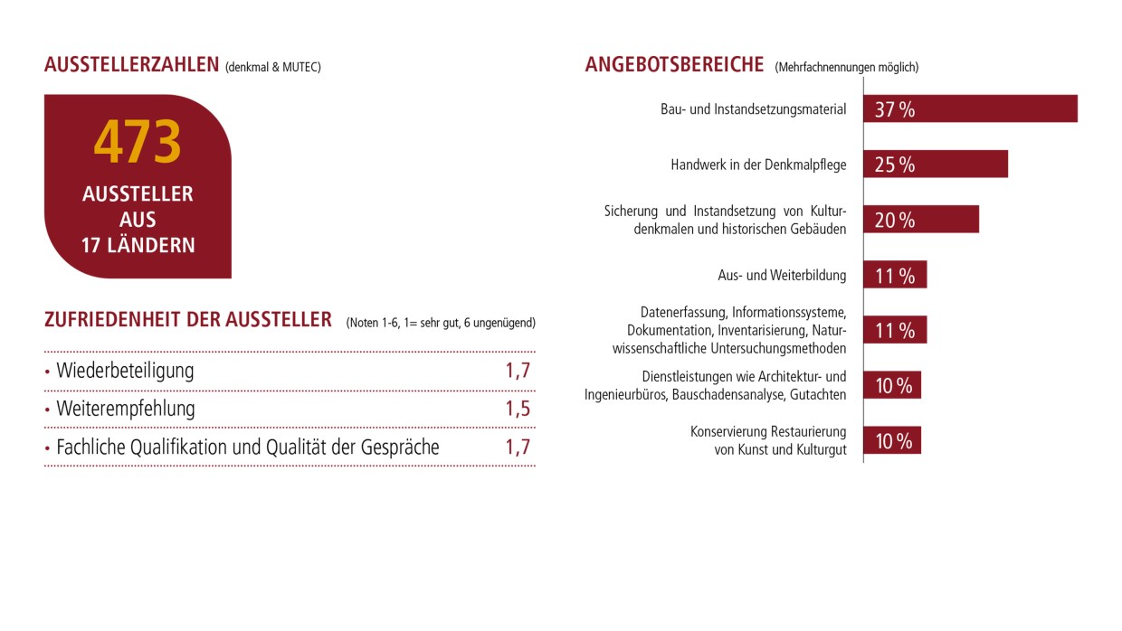 Diese Absicht äußert die überwältigende Mehrheit der Aussteller. 95 Prozent der vertretenen Unternehmen und Institutionen wollen auch auf der denkmal 2024 ausstellen und 98 Prozent empfehlen die europäische Leitmesse weiter.