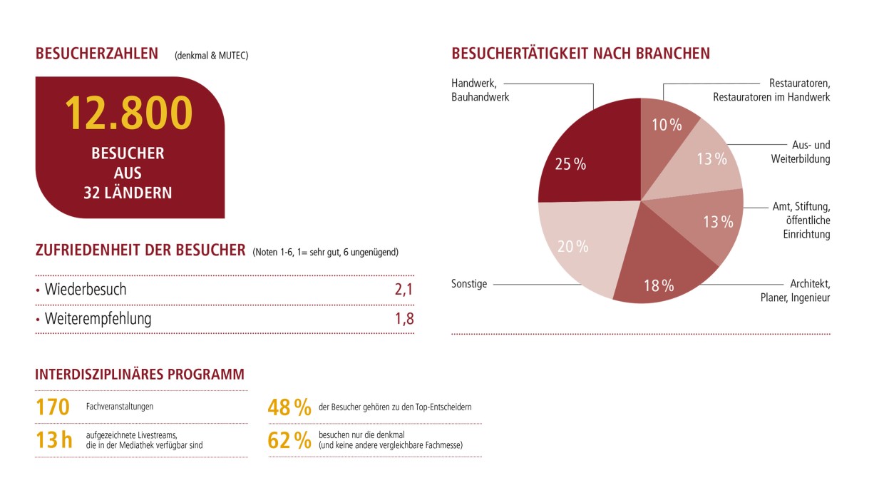 Nach der pandemiebedingten Absage vor zwei Jahren kehrten die denkmal und MUTEC vom 24. bis 26. November 2022 zur großen Freude aller Aussteller, Partner und Besucher sehr erfolgreich zurück. Die 14. Auflage der europäischen Leitmesse denkmal und die parallel stattfindende MUTEC erlebten einen Ansturm von insgesamt 12.800 Besuchern aus 32 Ländern. „Hinter uns liegen drei intensive Messetage, an denen man zu jeder Sekunde die Begeisterung aller Beteiligten spüren konnte. Geprägt von Geschäftsanbahnungen, Fachgesprächen und persönlichen Begegnungen haben die denkmal und MUTEC eindrucksvoll gezeigt, welch große Bedeutung sie als international führender Branchentreffpunkt für die gesamte Fachwelt haben“, freut sich Markus Geisenberger, Geschäftsführer der Leipziger Messe. 473 Aussteller aus 17 Ländern beteiligten sich in diesem Jahr an dem Messeduo.